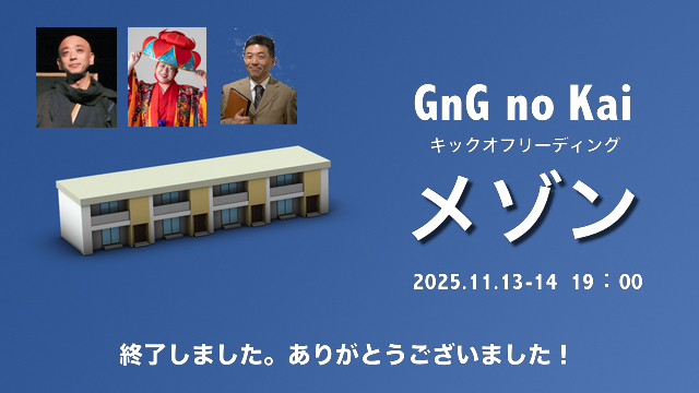 でいろいろやるエンゲキ回りユニット「GNG no kai」が始まりました。キックオフの「メゾン」は無事終了!今後は「戯曲を読む会」を継続開催して行きます。どうぞ今後の活動にご注目下さい!(11/15)