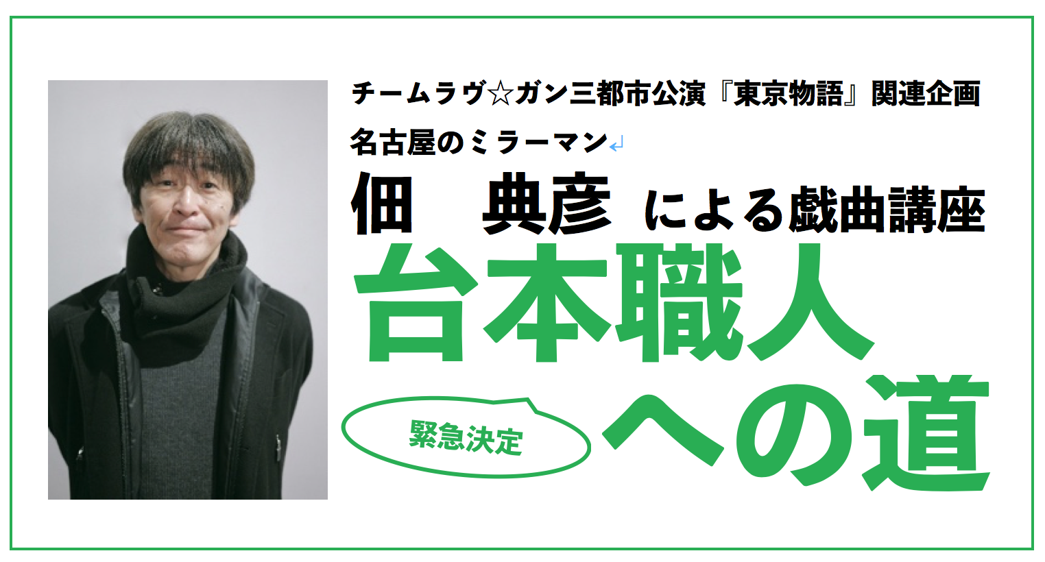 かつて「名古屋の若大将」、いまも劇作家・俳優として精力的に活躍される佃典彦さんの戯曲講座を、この春からツアー公演を控える「東京物語」の関連企画として開催することになりました。2月日程分は終了しましたが、3月に第二期を追加開催いたします。詳細は上の画像をクリックしてご確認下さい!(3/1)