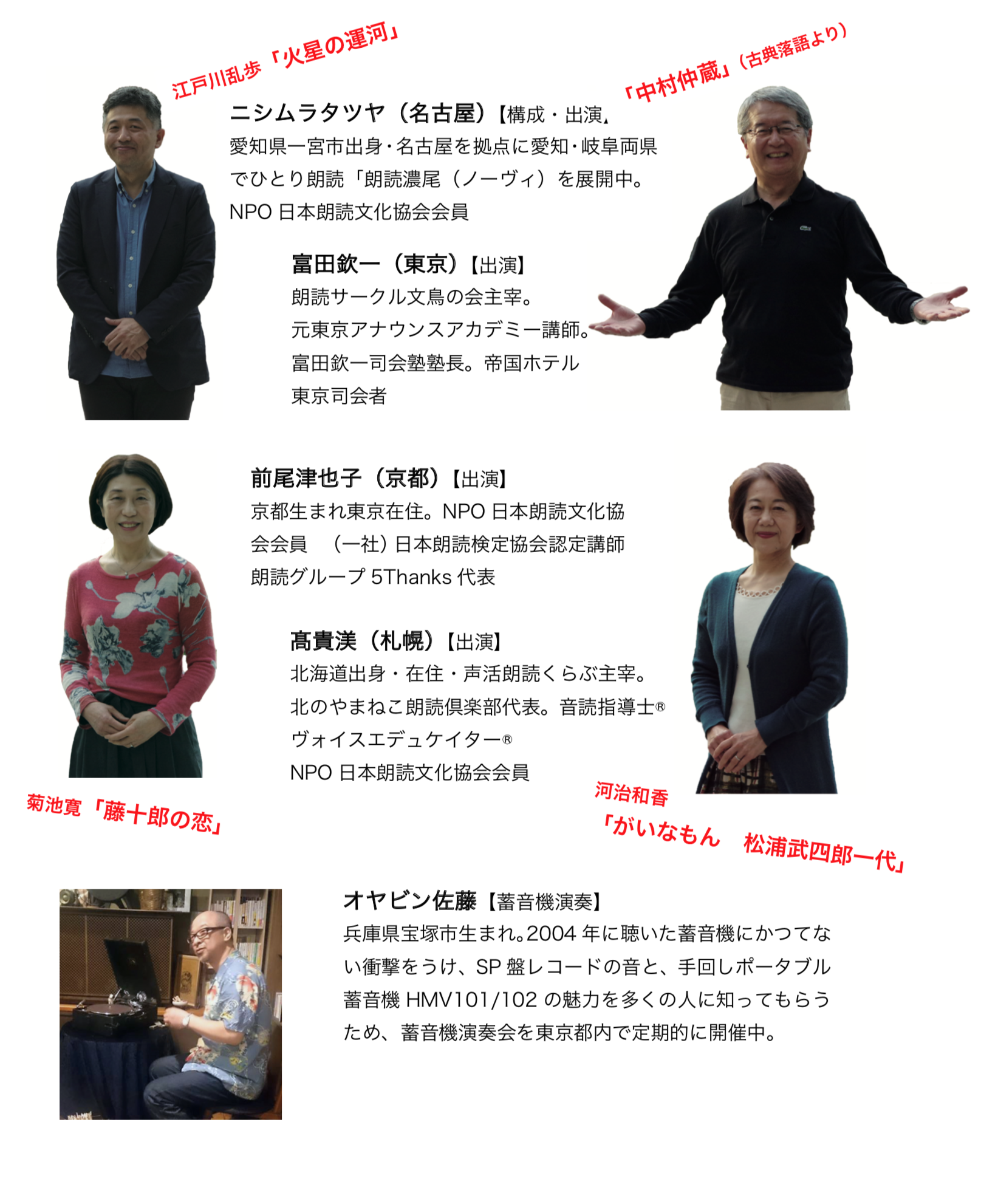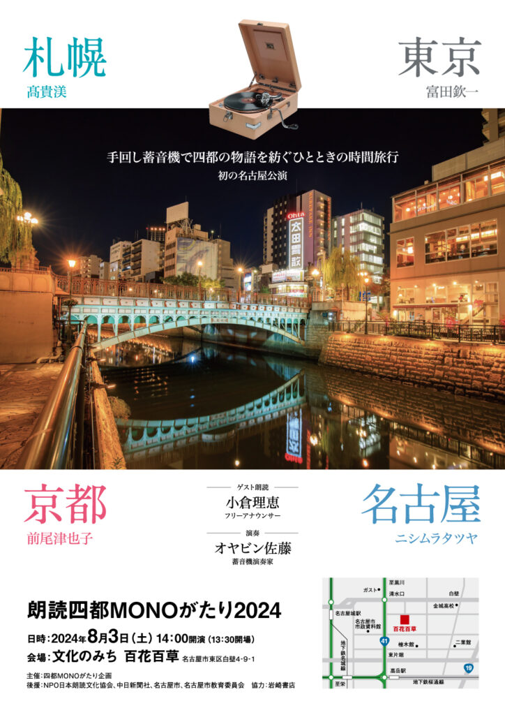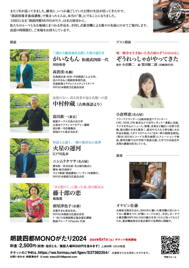 「ところ変われば、読み、変わる」のか、地元からのゲストもお迎えして、ささやかながら唯一無二の朗読会を目指します。 今回も、蓄音機演奏家の「オヤビン佐藤」 さんの選曲による数々の名曲とともに、お集まりの皆様をひとときの時間旅行にご案内します。