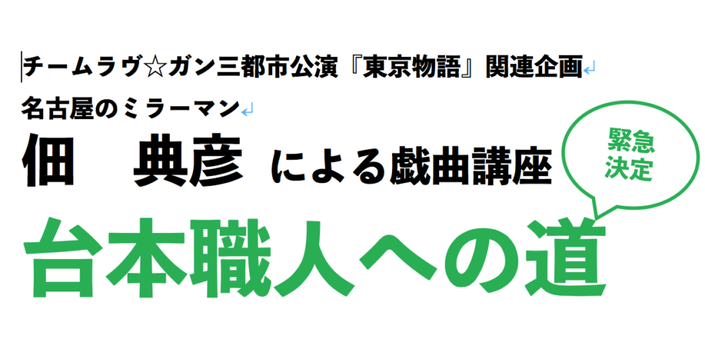 5月中旬から名古屋・横浜_京都3都市公演を行う「チームラヴ☆ガン」の「東京物語」の関連企画として、劇作家佃典彦の<戯曲の書き方>をお伝えし、短編戯曲を書いてもらう講座をお手伝いすることになりました。